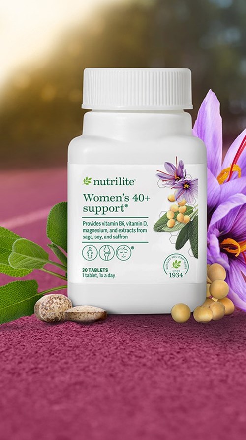 Nutrilite™ Women’s 40+ Support is a supplement to support women in their 40s and 50s who may experience physical and emotional discomfort during menopause. It contains extracts from soy, sage, saffron as well as vitamins D and B6, and magnesium.